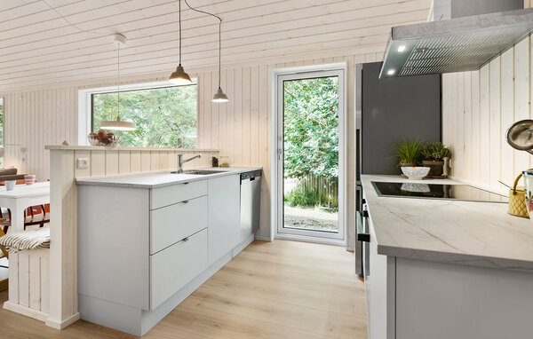 Beliggende i et lille skovområde byder dette charmerende feriehus nær Klint Strand jer velkommen til en rolige ferie midt i idylliske omgivelser. Huset udstråler hygge og varme, blandt andet med en indbydende sofa, der er perfekt til afslapning og fordybelse foran brændeovnen. Fra stuen kan I nyde udsigten til den velplejede have.