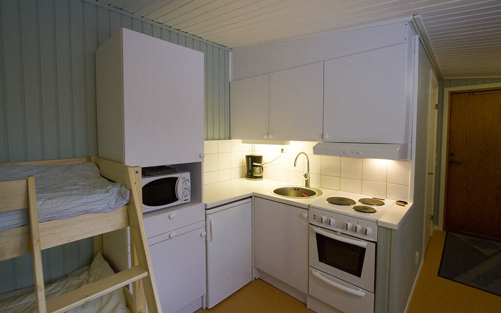 Opholdsstue med køkken og spiseplads til 4 personer. Køkkenet er udstyret med køle/fryseskab, komfur, ovn og mikroovn.