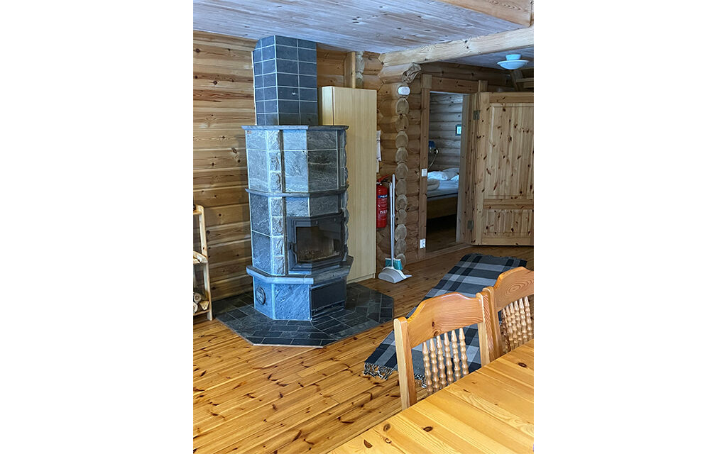 Køkkenet har en åben planløsning mod stuen med brændeovn og spiseplads til op til 4 personer.