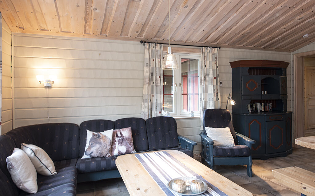Køkkenafsnittet har åben planløsning til stuen med brændeovn og spiseplads til op til 10 personer.