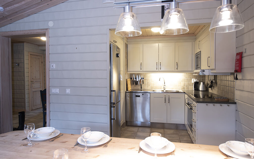 Køkkenet er udstyret med opvaskemaskine, køle-/fryseskab, induktionskogeplade, ovn og mikroovn.