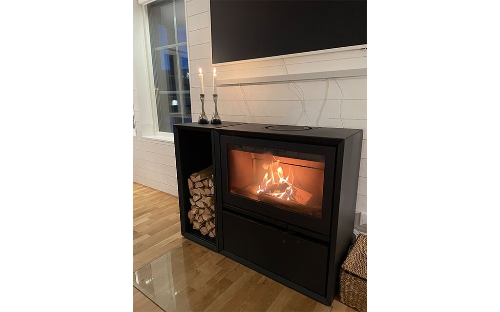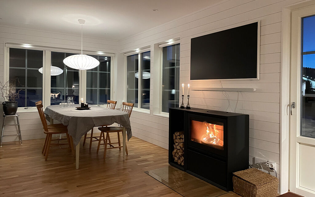 Køkkendelen har åben planløsning til stuen med brændeovn og spiseplads til op til 8 personer.