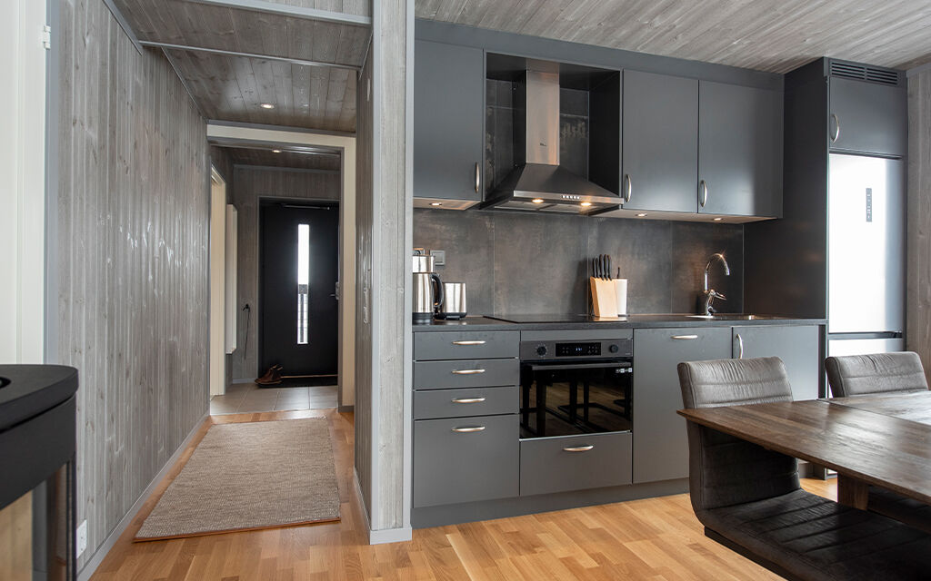Køkkenområdet har åben planløsning til stuen med brændeovn og spiseplads til op til 9 personer.