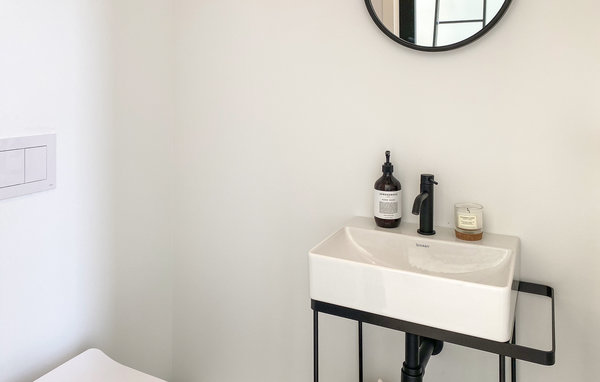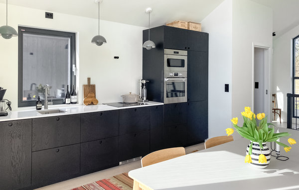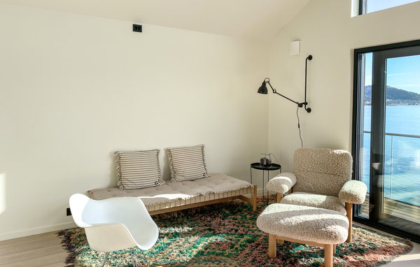 Dette luksuriøse feriehus forkæler jer med en privilegeret beliggenhed lige ud til vandet og et lyst og stilfuldt møbleret interiør. Glæd jer til hyggelige madlavningsaftener i det moderne køkken og hyggelige måltider i spisestuen, hvor vinduer fra gulv til loft tilbyder udsigt over havet. Slap af om aftenen med en god samtale i den eksklusive sofa, eller sæt jer godt til rette i læsestolen med en spændende bog.