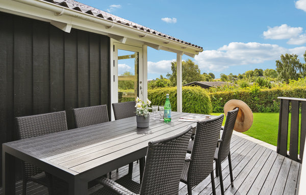 Det charmerende træhus byder velkommen i en smuk, rolig beliggenhed. De lyse værelser danner de ideelle rammer for en hyggelig stund sammen i en hjemlig atmosfære. Store vinduespartier slipper masser af dagslys ind i rummene. Spis i det fri med en vidunderlig udsigt og slap af i husets sauna. Efter en begivenhedsrig dag inviterer den behagelige sofa til film- eller spilleaften, her kan I hygge jer sammen, mens flammerne knitrer i brændeovnen. Nyd solen udenfor huset, mens jeres børn leger på naturgrunden. Afslut dagen med en lækker grillmiddag på terrassen og nyd de lange sommeraftener, senere kan I samle hele familien om et bål.