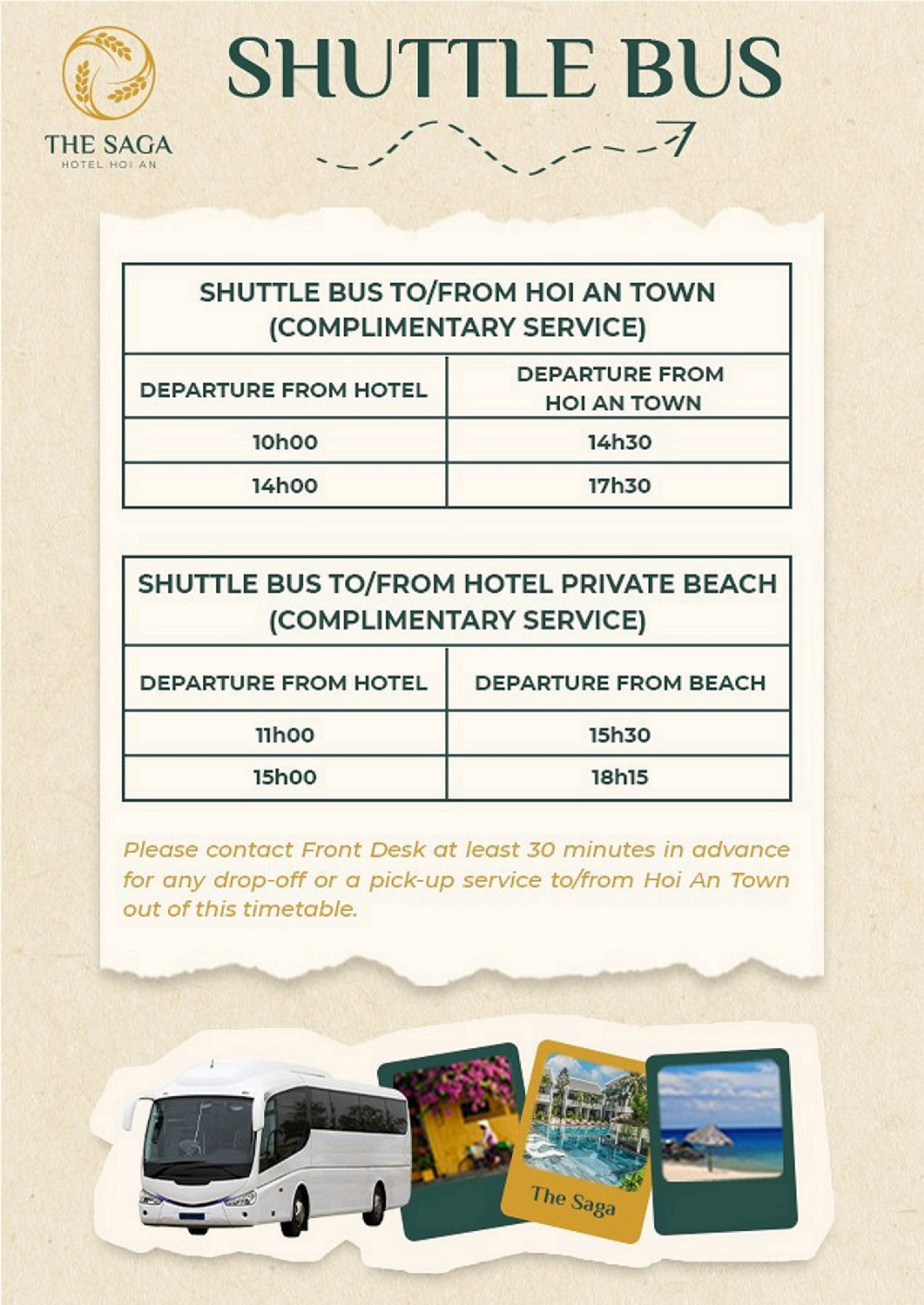 Der er i alt 116 gæsteværelser på stedet. Derudover tilbydes der Wi-Fi adgang på stedets fællesområder. The Saga Hotel Hoi An har 24 timers åbent. Fællesarealerne på The Saga Hotel Hoi An har kørestolsadgang. Der er parkeringsfaciliteter til rådighed for rejsende. The Saga Hotel Hoi An har alle de nødvendige services og bekvemmeligheder for en vellykket forretningsevent. Besøgende kan på egen hånd opleve madarrangementer udbudt af boligen. Gæsterne kan slappe af og få nye kræfter i ejendommens wellness-faciliteter. Der kan blive pålagt et gebyr for visse af disse services.