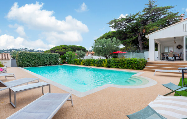 Oplev indbegrebet af luksus og afslapning i dette udsøgte feriehus i Saint-Maxime. Den stilfulde bolig er præget af moderne tilføjelser og elegante møbler, så her er der optimale rammer til at slappe af og have det rart. Den rummelige, overdækkede terrasse giver jer et perfekt sted til udendørs spisning. Den smukt anlagte have med indbydende poolområde og solterrasse sikrer, at I kan nyde middelhavsstemningen fuldt ud. Her får I fred og komfort i perfekt harmoni.
