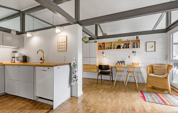 Tag familien med på ferie og slå jer ned i dette komfortable sommerhus. Kombinationen af de hvidmalede paneler i loftet og stenværk på væggene, samt flotte vinduesdetaljer under loftet giver huset en lys og indbydende stemning. Bjælkerne, trægulvet og den hyggelige indretning med brændeovn bringer en hjemlig følelse til huset, og gør det til en oplagt oase for jeres ferie.