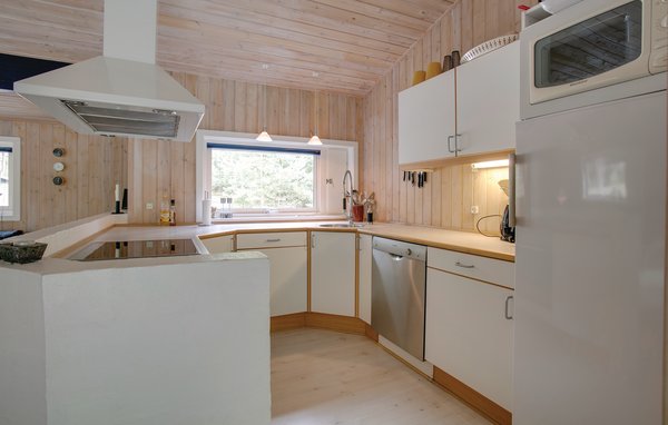 På en stor naturgrund, og i nærhed af god sandstrand, ligger dette velholdte og rummelige sommerhus. Huset fremtræder lyst og moderne indrettet overalt, og her er en rar stemning. Feriens måltider kan nemt tilberedes i det veludstyrede åbne køkken, og medens maden tilberedes, kan resten af familien slappe af i husets kombinerede opholds- og spisestue i de komfortable møbler. Brændeovnen og varmepumpen sørger for en behagelig temperatur i huset, uanset årstid, og der er gratis internet til rådighed. På den store træterrasse med pæne havemøbler, sansegynge og grill, kan I nyde ferien i fulde drag. Virkelig et dejligt feriehus til en lige så dejlig ferie.