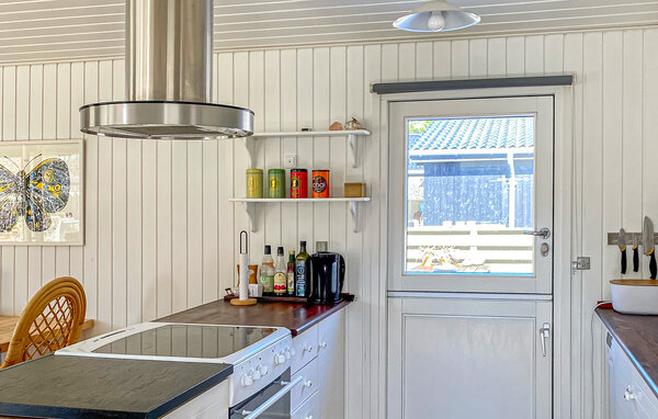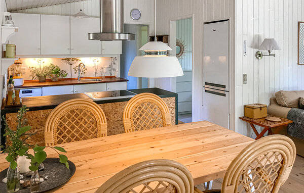 Velkommen til dette charmerende sommerhus, som ligger tæt ved Nyrupbugt. Her kan alle sænke skuldrene og sætte hverdagen helt på pause, for huset giver jer gode rammer til at slappe af og nyde feriedagene fuldt ud. Gør morgenmaden klar i det åbne køkken, og derefter kan I sætte jer til rundt om spisebordet. De store vinduespartier lukker solskinnet ind og gør stuen lys og venlig. Rund dagene af med ild i brændeovnen, brætspil og gode snakke om dagen, der er gået.