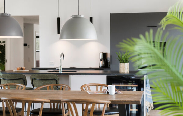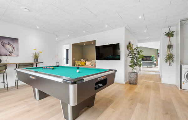 Slap af i den lyse opholdsstue med store vinduespartier og en komfortabel sofagruppe. Hyg jer på sofaen, og nyd den åbne atmosfære, mens blikket glider ud over det grønne. Spiseområdet hænger harmonisk sammen med det moderne køkken med kogeø – ideelt til hyggelige madlavningsaftener. Brug også billardbordet til en omgang spil og sjov, og forkæl jer selv med lidt wellness i husets sauna.