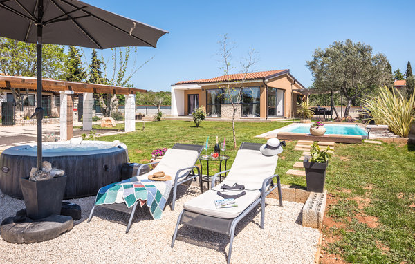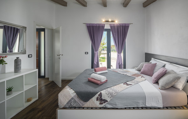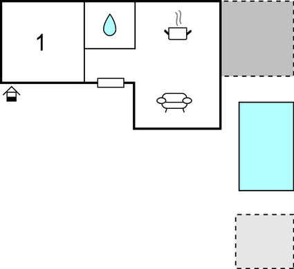 Husets hjerte er opholdsstuen med åbent køkken, hvorfra I har udsigt til poolområdet. Tilbered jeres feriemåltider sammen i det moderne køkken eller hold en filmaften, mens I læner jer tilbage i den store sofa. Der er også et soveværelse med en dobbeltseng.