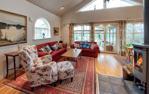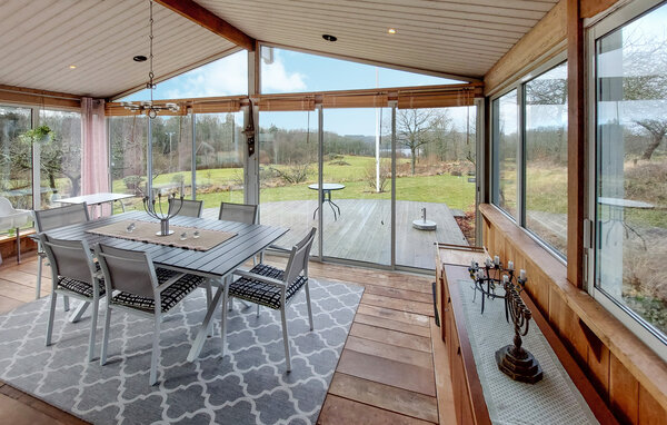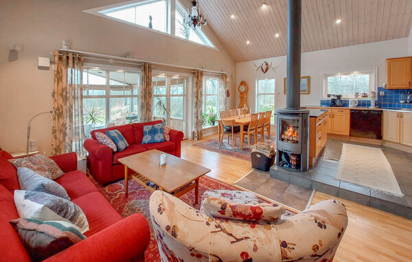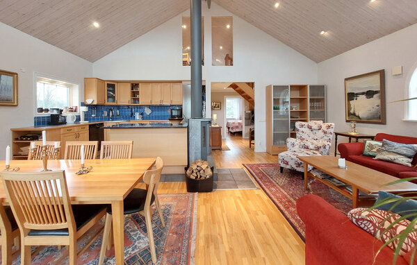 Dette hyggelige og nænsomt indrettede feriehus er perfekt til at tilbringe harmoniske dage i pagt med naturen med en større familie. Tænd brændeovnen og nyd hyggelige madlavningsaftener i det åbne køkken samt lækre måltider i den hyggelige spiseplads. Find jer godt til rette i sofaen med en bog, forkæl jer selv med hyggelige stunder i saunaen eller organiser en spilleaften.